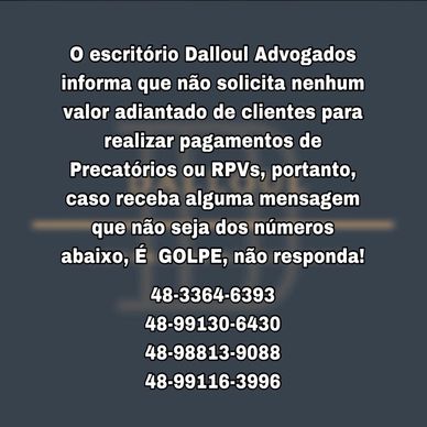 Prezados clientes. Informamos reiteradamente que o escritório Dalloul Advogados não envia mensagens pedindo qualquer valor adiantado para realizar a liberação de alvarás, precatórios ou RPV, nunca nenhum valor é solicitado aos clientes para tais liberações.